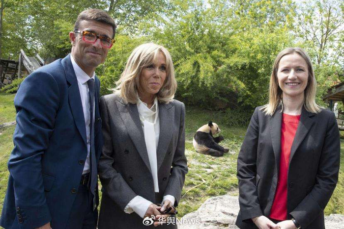 ▲当地时间2023年5月17日,法国总统马克龙夫人布丽吉特(中)到访法国圣艾尼昂市博瓦勒野生动物园,向即将被送回中国的大熊猫“圆梦”告别。中新社发 法国博瓦勒动物园供图