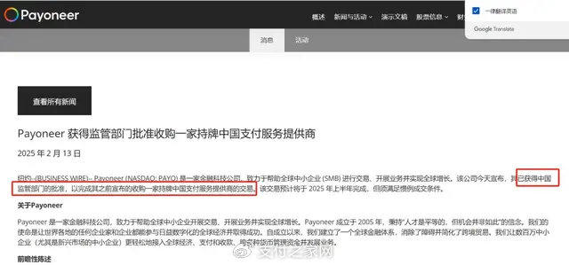 今年2月13日,Payoneer派安盈对外宣布,其已获得中国监管部门的批准,以完成其之前宣布的收购一家持牌中国支付服务提供商的交易。Payoneer派安盈称,该交易预计将于2025年上半年完成,但须满足惯例成交条件。