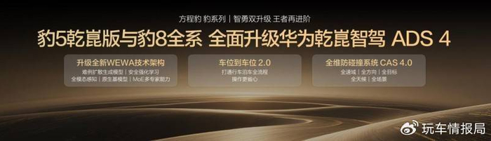 豹5乾崑版及豹8全系将升级华为乾崑智驾ADS 4,实现了从类人驾驶到超人驾驶的重大升级。首先,升级全新WEWA技术架构,让辅助驾驶可以云端自主学习进化,越用越丝滑;车位到车位功能也升级至2.0版本,打通了行车到泊车的全流程,全程衔接无缝,操作更省心;此外,还有全维防碰撞系统CAS 4.0,可以覆盖全路况、全天候,安全制动更快更灵敏,让长途驾驶不再疲惫,让城市通勤安全又轻松。