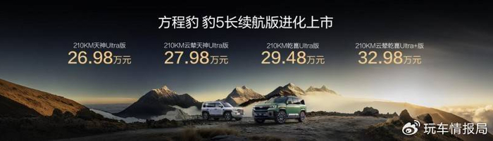 10月20日,方程豹汽车“豹5长续航版”焕新上市,价格26.98-32.98万元;豹8大五座版加推上市,价格37.98-40.78万元。方程豹以“人人可野·拥豹新生活”为核心主张,以豹5的10万台销量达成,以及品牌的20万台销量达成,宣告着电驱越野时代的全面到来。豹5持续蝉联硬派越野销量冠军,登顶“越野新王”,豹8则以引领40万级高端新能源SUV的姿态成为比亚迪华为联手打造的“稀缺旗舰”。本次方程豹豹系列产品,实现了DMO平台的DMO+升级、华为乾崑智驾的ADS 4升级、以及比亚迪智慧生态等多项顶级核心科技的全面升级,在续航、安全、舒适、操控等全维度提升,为更多用户带来系统性升级新选择。