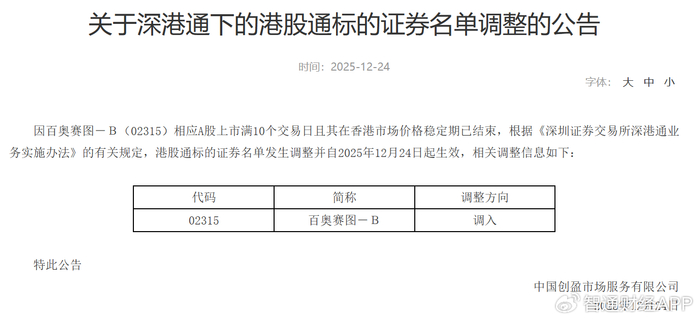 近日,上交所与深交所公告,将百奥赛图-B(02315)调入港股通股票名单,自2025年12月24日起生效。此举标志着公司构建“A+H”双资本市场平台后的又一重要里程碑,其港股通道自此向内地投资者全面敞开。