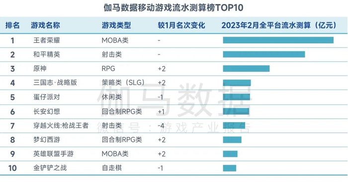 2023年2月,伽马数据移动游戏流水测算榜TOP10中产品名次变化幅度较小,最高变化4名,有5款产品排名上升,此外,本月仅有《英雄联盟手游》为环比新入榜产品。