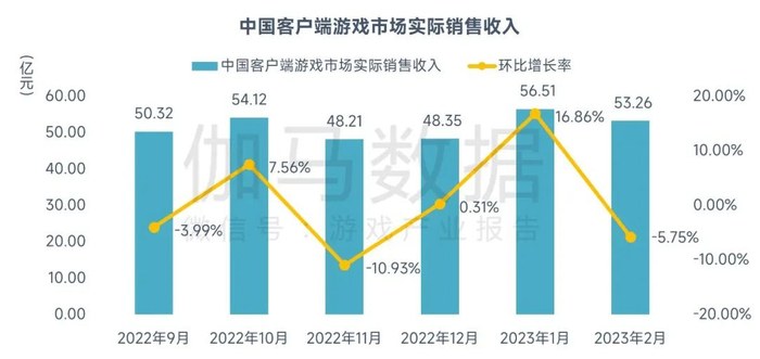 数据来源:中国游戏产业研究院&伽马数据(CNG)2023年2月,中国客户端游戏市场规模为53.26亿元,环比下降5.75%,同比增长3.69%。环比下降主要原因有二:一方面二月天数比一月减少3天;另一方面,随春节假期结束,较多产品2月举办的活动数量、付费意愿激发力度等有所下降。另外,从产品表现来看:监测的TOP100客户端游戏产品直播热度环比下降、较多产品2月流水环比下降。