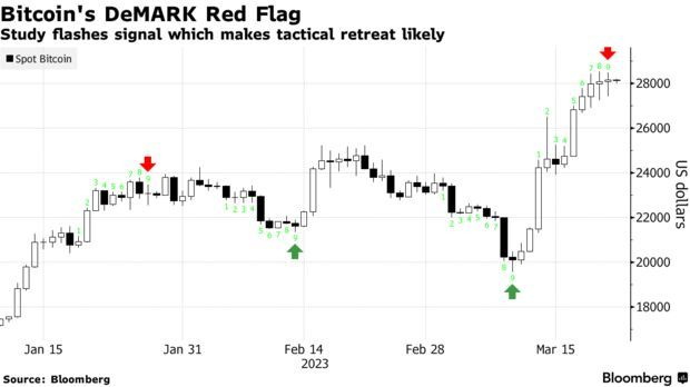 德马克序列指标(DeMARK Sequential indicator)是一种用来把握市场反转时机的指标,它表明,当动量达到13的耗尽点时,某个标的资产的主流趋势可能会被打断,要么出现反转,要么出现停顿。而比特币的这一指标在最近升至9,预示着其涨势可能停止乃至出现回调。不过,Fairlead Strategies LLC创始人Katie Stockton表示,这一指标支持中性的短期偏好,但其他图表模式可能很快指向“长期突破”。