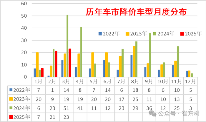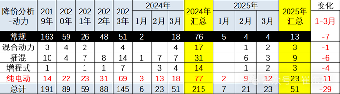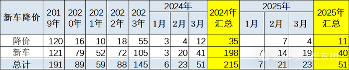 2025年截止到3月的降价车型总体不多,主要是新能源车,集中在2-3月。燃油车1月较多,但仍属正常。