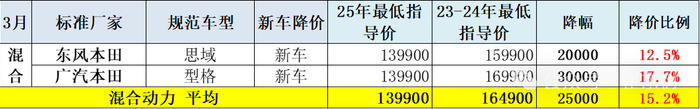 2025年3月份混合动力车型新车降价的均价是14万元,幅度达到2.5万元,新车降价力度达到15.2%。由于部分高端车型的降价开始发力,因此总体降价幅度较大。