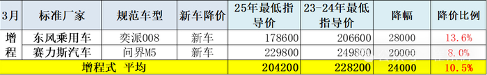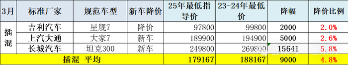 2025年3月份插混车型新车降价的均价是17.9万元,幅度达到0.9万元,新车降价力度达到4.8%。降价车型总体力度相对温和,但价格逐步形成头部领军企业同步的价格水平,这样的降价是必然的趋势。
