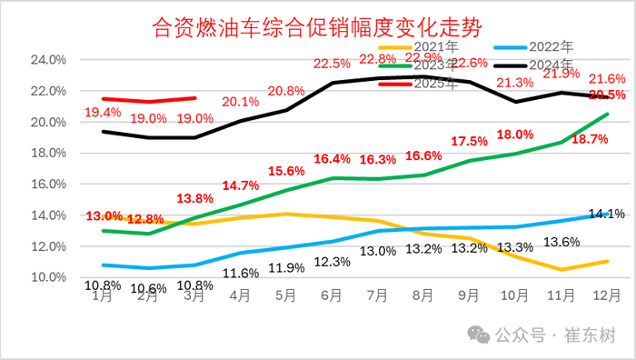 2025年3月合资燃油车的促销逐步达到21.5%的高位,较同期增加2.5个百分点。合资促销剧烈增长,从2023年的13%的低位,2024年3-6月进一步大幅增长到22.5%,8月突破22.9%,随后企稳,今年3月在21.5%。