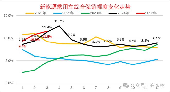 2025年3月的新能源车的促销逐步达到11.5%的高位,较同期基本持平。近几个月的促销加大,随着降价的温和,促销体系优势显现,目前已达到正常促销水平的高位。