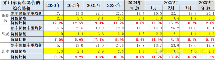 2025年3月份纯电动车型新车降价的均价是17.6万元,幅度达到1.75万元,新车降价力度达到9.1%。2025年3月份插混车型新车降价的均价是17.9万元,幅度达到0.9万元,新车降价力度达到4.8%。2025年3月份燃油车型新车降价的均价是13.2万元,幅度达到0.78万元,新车降价力度达到5.5%。2025年3月份混合动力车型新车降价的均价是14万元,幅度达到2.5万元,新车降价力度达到15.2%。2025年3月份增程式车型新车降价的均价是20.4万元,幅度达到2.4万元,新车降价力度达到10.5%。