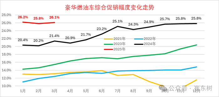 2025年3月豪华车的促销逐步达到26.1%的高位,较同期增加4.7个百分点。虽然消费升级推动高端需求较强,但由于新能源的分流,2024年4-7月豪华车促销力度持续增大到25.1%,处于历史新高水平。随着减产稳价,8月豪华车促销降到24.3%,但随着市场竞争激化,2025年1月促销力度回升到26.2%的高位,3月相对稳定。