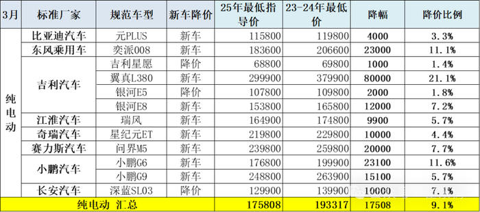 2025年3月份纯电动车型新车降价的均价是17.6万元,幅度达到1.75万元,新车降价力度达到9.1%。今年3月的纯电动的降价规模总体也是很大的,尤其是部分车型的降价达到20%以上,加上一些模式调整的降价,其力度还是很惊人的。