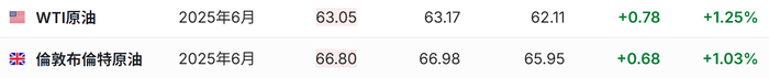 3. 截至发稿,WTI原油涨1.25%,报63.05美元/桶。布伦特原油涨1.03%,报66.80美元/桶。