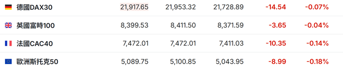 2. 截至发稿,德国DAX指数跌0.07%,英国富时100指数跌0.04%,法国CAC40指数跌0.14%,欧洲斯托克50指数跌0.18%。