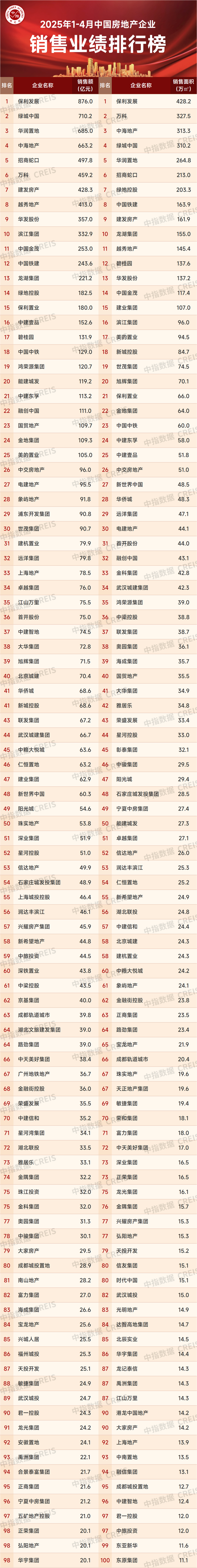 智通财经APP获悉,中指研究院发布《2025年1-4月中国房地产企业销售业绩排行榜》。2025年1-4月,TOP100房企销售总额为11198.6亿元,同比下降10.2%,降幅较1-3月基本持平。4月单月,TOP100房企销售额同比下降16.9%,较3月单月降幅有所扩大。1-4月销售总额超百亿房企25家,较去年同期较少3家,五十亿房企52家,较去年同期减少5家。TOP100房企权益销售额为7959.9亿元,权益销售面积为4070.9万平方米。