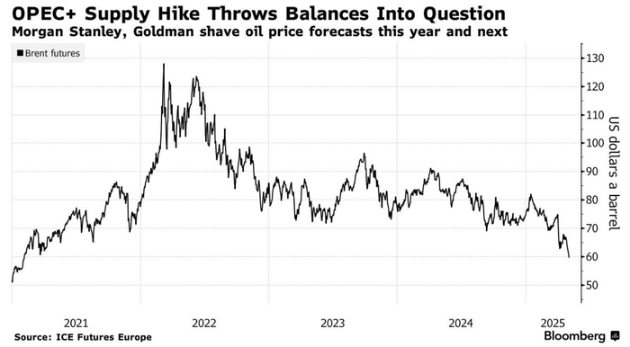 智通财经APP注意到,沙特主导的激进举措正在重塑全球石油市场格局——通过欧佩克+大幅增产,这一行动正迫使华尔街分析师纷纷下调油价预测、修正供应过剩警告,并准备迎接更多变数。周一布伦特原油期货收跌2.7%至59.63美元/桶。