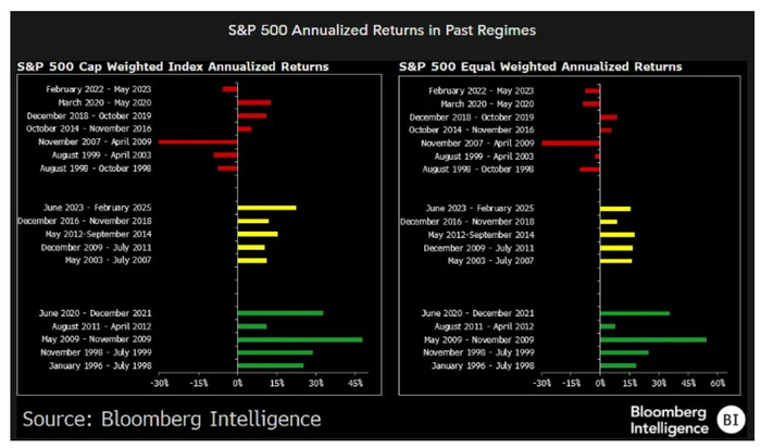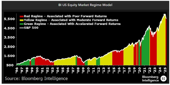 这项追溯至1996年的数据显示,红色周期通常伴随年化负收益,平均持续约16个月。标普500指数在红色周期中年化平均下跌5.6%,而在绿色周期中年化平均上涨29%。最近一次红色周期始于2020年6月,当时美股正从疫情引发的抛售中反弹。