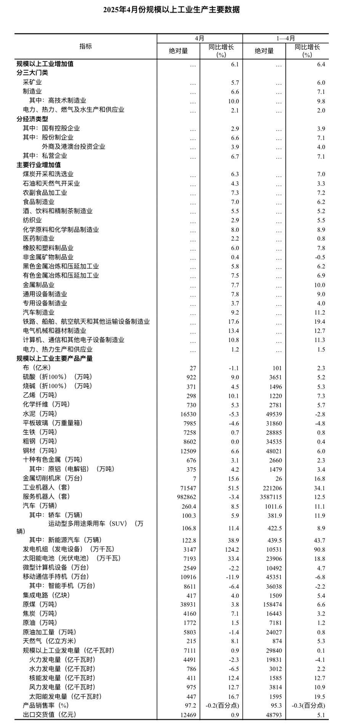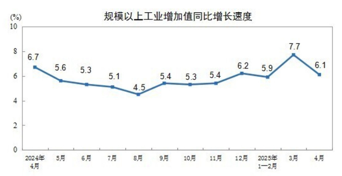 2025年4月份规模以上工业增加值增长6.1%