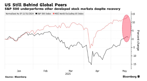 尽管美国股市受益于特朗普政府在贸易问题上措辞的缓和——特别是与中国的暂时休战——但美股反弹力度仍逊于其他主要市场。标普500指数较2月19日历史高点仍有3%差距,而MSCI非美国指数在本周二已创下新高。