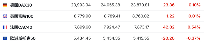 2. 截至发稿,德国DAX指数跌0.10%,英国富时100指数跌0.01%,法国CAC40指数跌0.54%,欧洲斯托克50指数跌0.37%。