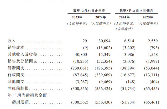 业绩方面,于2023年度、2024年度、2024年以及2025年截至3月31日止三个月,轩竹生物实现收入分别为2.9万元、3009.4万元、651.4万元、255.9万人民币;同期,年/期内亏损及全面亏损总额分别为约3.01亿元、约5.56亿元、5173.4万元、6546.1万元人民币。