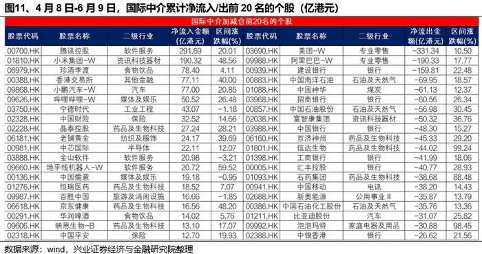 外资显著青睐具有特色商业模式的科技和消费企业,减持红利板块,医药内部有所分化。4月8日-6月9日期间,国际中介主要加仓腾讯控股(00700)、小米集团-W(01810)、珍酒李渡(06979)、香港交易所(00388)和小鹏汽车-W(09868),而净流出较多的标的包括美团-W(03690)、阿里巴巴-W(09988)、建设银行(00939)、中国海洋石油(00883)和中国神华(01088)。