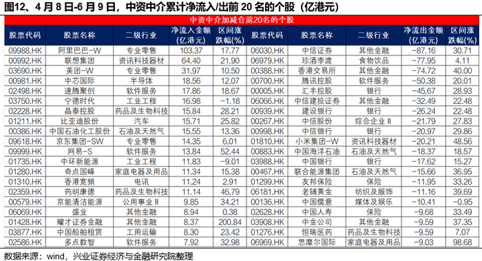 中资中介主要净流入阿里巴巴等科技股,减仓金融行业较多。4月8日-6月9日期间,中资中介主要加仓阿里巴巴-W(09988)、联想集团(00992)、美团-W(03690)、中芯国际(00981)和速腾聚创(02498),净流出较多的标的包括中信证券(06030)、珍酒李渡(06979)、香港交易所(00388)、腾讯控股(00700)和汇丰控股(00005)。