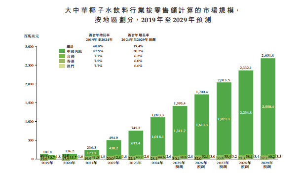 其中,2019年至2024年,大中华市场椰子水饮料行业大幅扩张,市场规模由1.02亿美元增长至10.93亿美元,复合年增长率为60.8%。其中,中国内地市场规模由2019年的4970万美元增至2024年的10.18亿美元,复合年增长率为82.9%,预计2029年将达25.50亿美元。