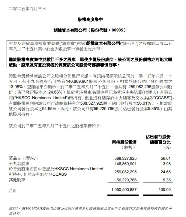 智通财经APP获悉,香港证监会最近曾就胡桃资本(00905)的股权分布进行查讯。查讯结果显示,于2025年8月25日,有19名股东合共持有146,869,901股公司股份,相当于公司已发行股本的13.98%。查讯结果亦显示,于同日,合共有259,082,295股公司股份(占已发行股本的24.66%)虽于香港股东名册中登记为香港中央结算(代理人) 有限公司(“HKSCC Nominees Limited”)所持有, 但并没有结存于中央结算及交收系统(“CCASS”)。有关股权连同由公司行政总裁持有的588,327,925股(占已发行股本56.01%),相当于公司发行股本的94.65%。因此,该公司只有56,220,766股(占已发行股本5.35%)由其他股东持有。