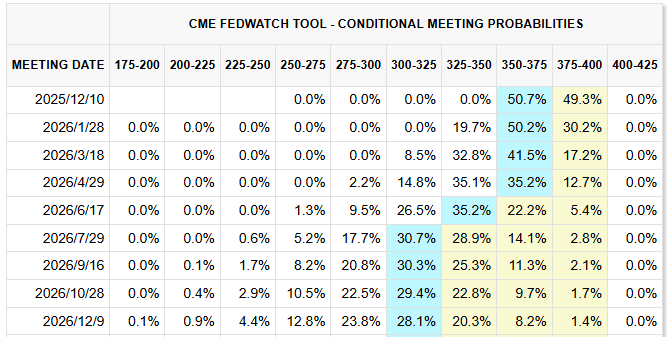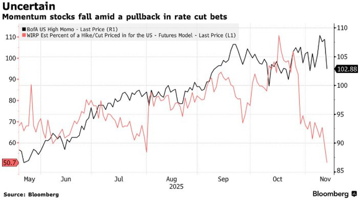 智通财经APP获悉,由于美国政府停摆导致关键数据无法获取,美联储的决策者们如今陷入了盲目的境地,这种不确定性正在考验着投资者的神经。周四,美国市场突然出现风险规避情绪,导致今年涨幅最大的一些股票大幅下跌,同时加剧了近期加密货币市场的跌势。许多交易员认为,美联储在 12 月再次降息的可能性降低是此次抛售的最主要原因。掉期交易员预计降息的概率约为 50%,较一周前的 72%有所下降,而美联储官员近期的言论也未表明他们对此举抱有坚定态度。