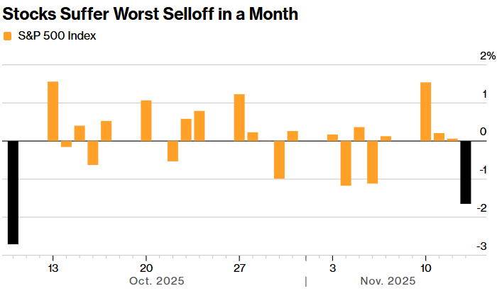 科技股的暴跌致使美国股市指数遭遇了近一个月来最大的跌幅,同时这也终结了此前连续四天的上涨态势。在主要的美国股票指数中,纳斯达克 100 指数表现最差,下跌了 2%。比特币的跌幅进一步扩大,已从 10 月份的历史高点下跌了超过了 22%。标普500指数收盘下跌 1.7%,受到信息技术和消费非必需品板块拖累,下跌的股票数量几乎是上涨股票数量的三倍。而道琼斯工业平均指数则下跌了 1.7%,创下近一个月以来的最差表现。此前,该蓝筹股指数在周三首次收于 48000 点上方。