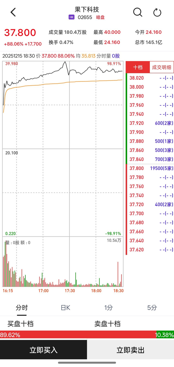 智通财经APP获悉,AI互联网储能龙头+AI机器人安全第一股果下科技(02655)将于2025年12月16日(星期二)在香港挂牌。截至收盘,利弗莫尔证券暗盘交易显示报价37.80港元,较招股价20.10港元上涨88.06%,每手100股,不计手续费,每手赚1770港元。