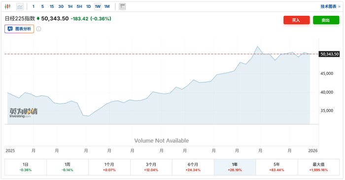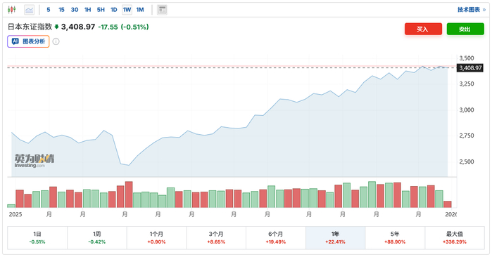 今年4月初,在美国总统特朗普对外大规模加征关税的余震中,东证指数一度暴跌。随后,在贸易战担忧缓解、以及日本股市相对于美欧股市被低估的情况下,日本股市重获青睐。此外,日元持续疲软让外资能以更低成本购入日本资产,从而刺激需求。在对日本企业盈利改善、高市早苗政府财经刺激计划以及全球流动性过剩的预期推动下,东证指数在年末持续创下新高。