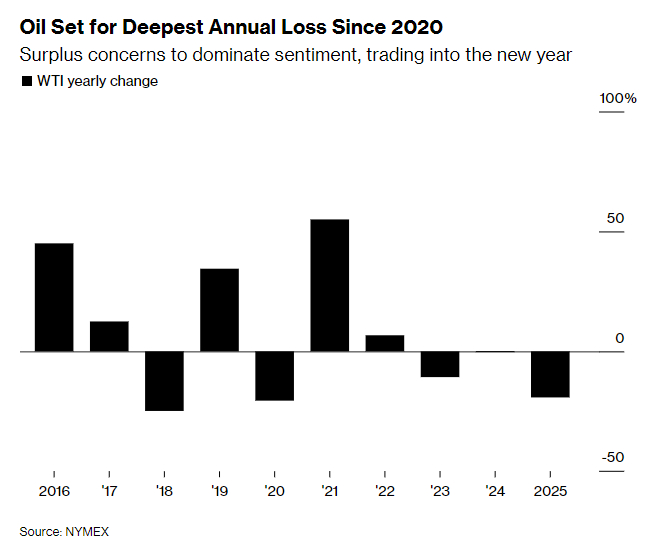 智通财经APP获悉,受市场对供应过剩的持续担忧拖累,国际油价正迈向2020年疫情爆发以来最严重的年度下跌。这一利空因素不仅主导当前市场情绪,还将对新一年的交易走势形成压制。