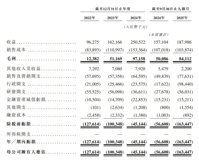 于2022年度、2023年度、2024年度、2024年以及2025年截至9月30日止九个月,斯坦德机器人年/期内亏损分别为约1.28亿元、约1.0亿元、4514.4万元、5660.8万元、约1.63亿元人民币。