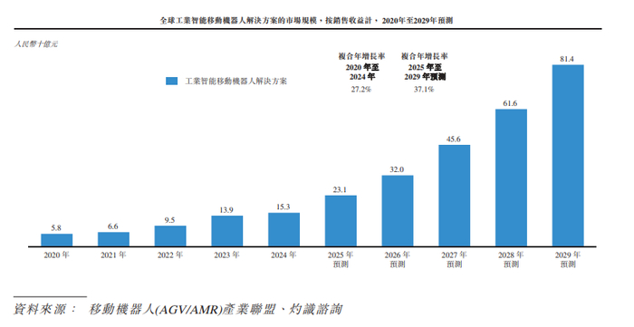 全球工业智能移动机器人解决方案市场规模由2020年的人民币58亿元增长至2024年的人民币153亿元,复合年增长率为27.2%。随着越来越多的企业引入并应用工业智能机器人解决方案,预计2029年全球工业智能移动机器人解决方案市场规模有望进一步增长至人民币814亿元,2025年至2029年的复合年增长率为37.1%。