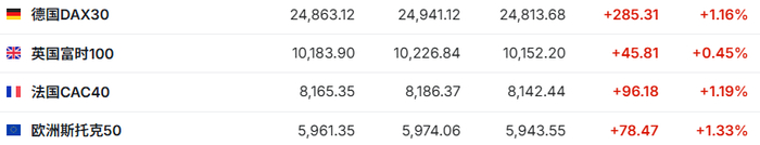 2. 截至发稿,德国DAX指数涨1.16%,英国富时100指数涨0.45%,法国CAC40指数涨1.19%,欧洲斯托克50指数涨1.33%。