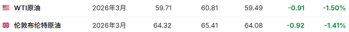 3. 截至发稿,WTI原油跌1.50%,报59.71美元/桶。布伦特原油跌1.41%,报64.32美元/桶。