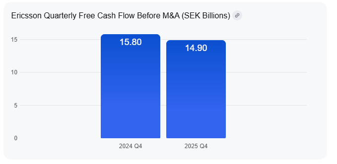 支撑此次股票回购计划的核心在于其充沛的现金流,截至 2025 年末,爱立信的净现金储备已由上年同期的 378 亿瑞典克朗大幅增至 612 亿瑞典克朗,第四季度不计并购的自由现金流达到 149 亿瑞典克朗,充足的“弹药”储备为股东回报提供了坚实基础。