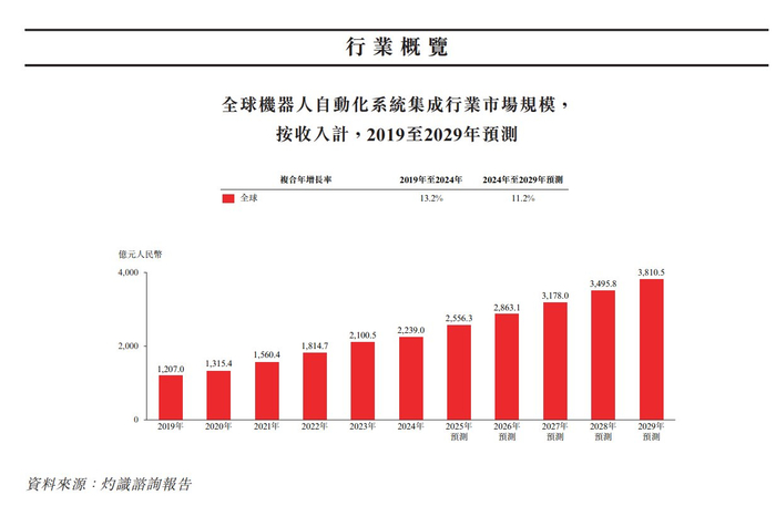对终端客户而言,引入专业系统集成商的价值,也已从简单的人力替代和成本节约,延伸为通过端到端的工艺与数据整合,实现质量更稳定、节拍更可预测,并在后续扩产和产线改造时具备更强的可扩展性。未来,全球机器人自动化系统集成行业预计将继续维持增长态势,至2029年市场规模有望达到人民币3,810.5亿元,自2024年至2029年的复合年增长率预计为11.2%。
