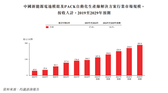 因此,全球新能源电池模组及PACK自动化生产线解决方案行业整体保持快速增长。全球行业市场规模由2019年的约人民币71.4亿元增长至2024年的约人民币232.9亿元,复合年增长率为26.7%。在此期间,固态电池、大圆柱电池等新兴电池技术路线的迭代升级亦推动相关企业对原有模组及PACK生产线进行改造升级或重建,形成新一轮系统集成需求。
