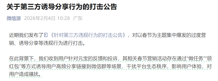 智通财经APP获悉,2月4日,微信官方账号“微信派”发布关于第三方诱导分享行为的打击公告,对以春节为主题集中爆发的过度营销、诱导分享等违规行为进行打击。公告表示,收到用户针对元宝的反馈和投诉,其相关春节营销活动存在通过“做任务”“领红包”等方式诱导用户高频分享链接到微信群等场景,干扰平台生态秩序、影响用户体验、对用户造成骚扰。经研判,对元宝的违规链接进行处置,限制其在微信内直接打开。相关处置措施即日生效。对此,元宝在公告评论区回应称:“我们完全理解并尊重平台规则,已第一时间优化活动设计,确保合规体验。感谢大家的监督与支持”。