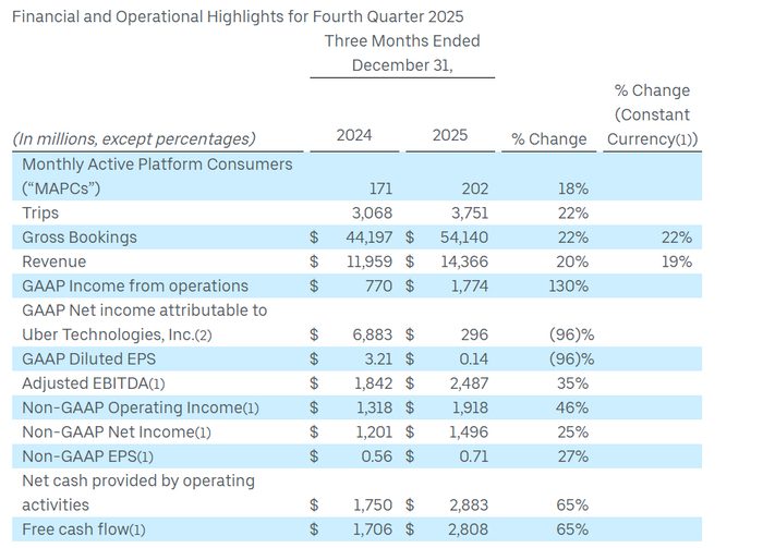 2025年第四季度业绩方面,优步可谓交出了一份堪称满分的答卷。优步Q4 GAAP 准则下的营业利润高达18亿美元,创下历史新高,同比大增130%,该公司第四季度总营收约143.7亿美元,同比增长20%,与华尔街平均预期基本一致。优步第四季度Non-GAAP准则下的净利润约15亿美元,实现同比增长25%,Non-GAAP准则下的调整后每股收益0.71美元,高于上年同期的0.56美元。