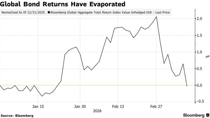 智通财经APP获悉,受中东局势加剧引发的通胀担忧推动,全球债券市场在近期遭遇了猛烈的抛售潮,此前在2026年初积累的涨幅已悉数回吐。由于投资者担心战争可能导致能源价格长期处于高位,原本对通胀降温的乐观预期迅速逆转,这一转变直接反映在债券价格的滑坡上。根据彭博全球综合指数(该指数用于追踪投资级政府债券与公司债券的总回报情况)的最新数据显示,该指数已跌至年初水平,彻底抹去了早前超过2%的累计回报。