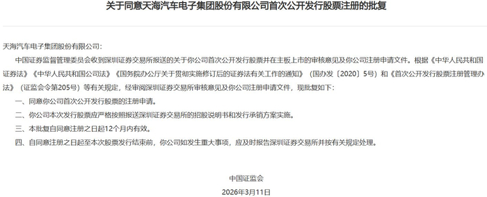 智通财经APP获悉,3月12日,证监会发布《关于同意天海汽车电子集团股份有限公司首次公开发行股票注册的批复》。据悉,天海电子拟在深交所主板上市,招商证券为其保荐机构,拟募资24.6042亿元。