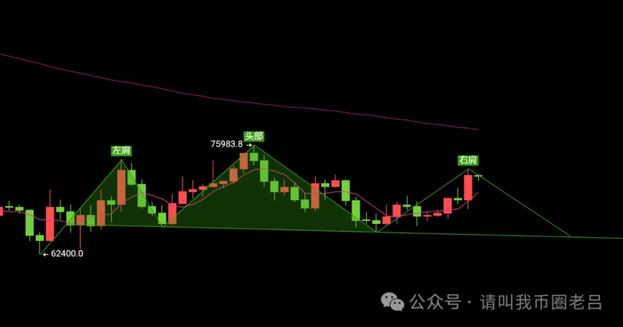 如果按照日线一个不规则的头肩顶形态去看的话(如图),右肩的位置需要看左肩的压制,如果按照日线实体阴线部分,那么压制位置刚好在72700,早间已经受阻,但如果按照开跌口上影线的位置,压力位是在74200,这么一看两者距离太远,所以,真要入空的话,这个止损就不太好设置了,与其这样,我们不如继续等一个回落去做多。目前最高价格72700美元,所以我们文章先按照这个最高价格去向下找支撑,强支撑:66666美元,但如果后续继续打破72700美元高点,我们再去找新的支撑位,而当前的价格对于多头来说一定不能追。要么就是等多头完全泄力,深度回踩后二次跟进。要么就是深度冲高后开中线空。如果继续冲高,我们会二次跟进做多的位置,没有新文章就是计划不变。
