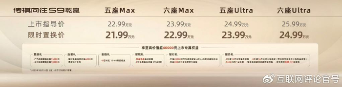 传祺向往 S9 乾崑上市指导价 22.99 万元起,可选五六座,满足不同用户购车需求。同时还为用户准备了六大诚意十足的上市礼包,综合价值超 40000 元。