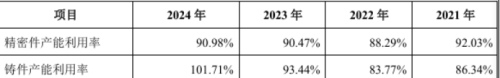对于此次IPO,南特科技计划募集资金2.86亿元,其中2.47亿元用于安徽中特高端精密配件生产基地二期项目,3868.80万元用于珠海南特机加扩产及研发能力提升项目。而从当前公司核心产品产能利用率来看,的确已经相当饱和,公司募资扩产用于自身发展迫在眉睫。