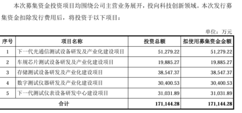 此次IPO,联讯仪器计划募资17.11亿元,其中5.13亿元用于下一代光通信测试设备研发及产业化建设项目,1.99亿元用于车规芯片测试设备研发及产业化建设项目,3.85亿元用于存储测试设备研发及产业化建设项目,3.04亿元用于数字测试仪器研发及产业化建设项目,3.1亿元用于下一代测试仪表设备研发中心建设项目。