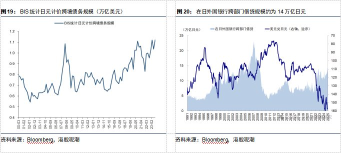 以BIS统计的从日本借出以日元计价的跨境债务规模衡量套利交易规模,数据更新至2023Q3大约有1万亿美元,而经过这两年套利交易猛增,当前规模远不止1万亿美元。若以在日本的外国银行分部跨部门借贷规模来看,截至2月底大致为14万亿日元左右。日本持有规模达1.1万亿美元,如果日债量化紧缩政策持续,大规模套利交易平仓引发的资金撤离,可能引发全球的流动性危机。
